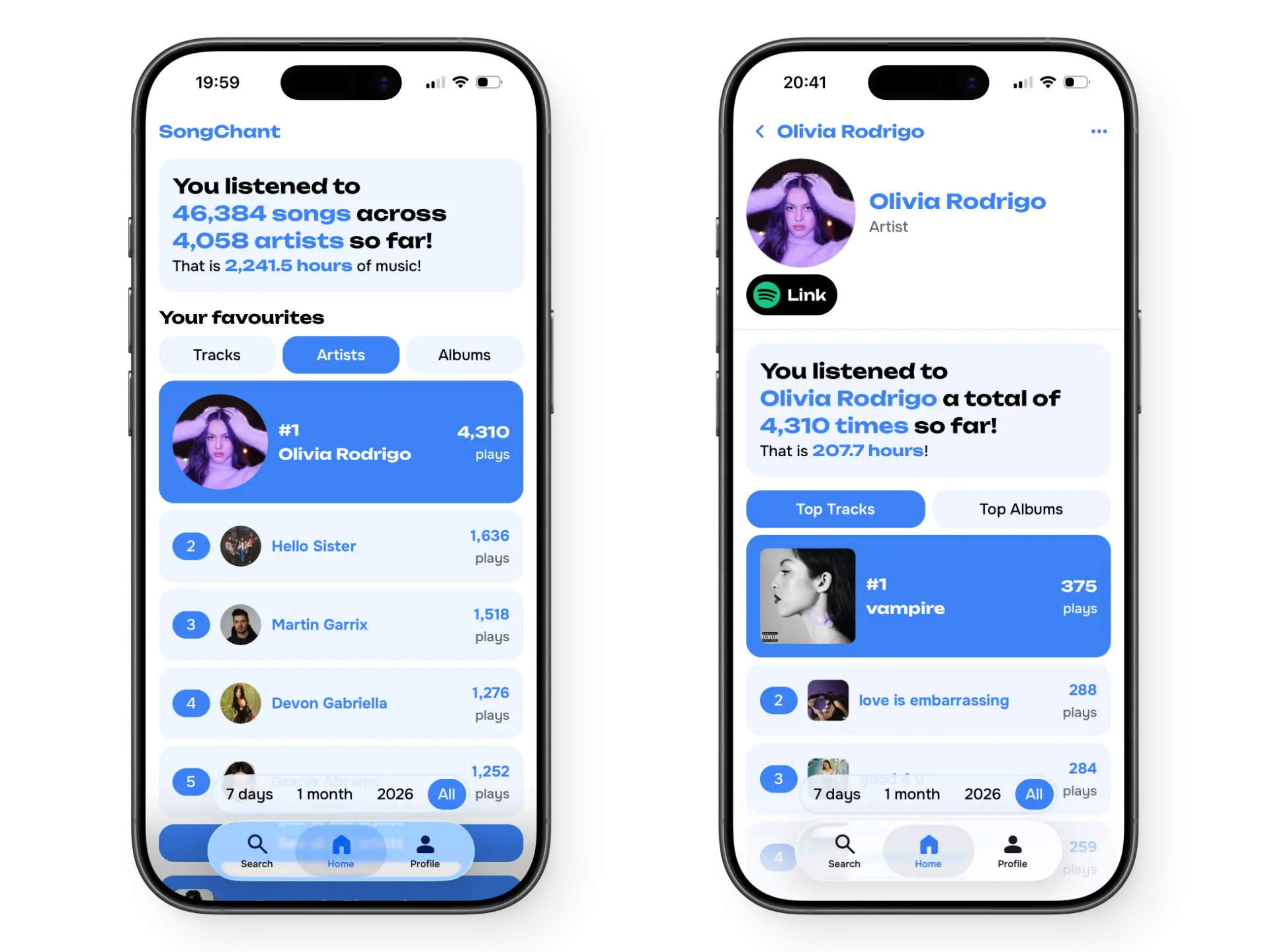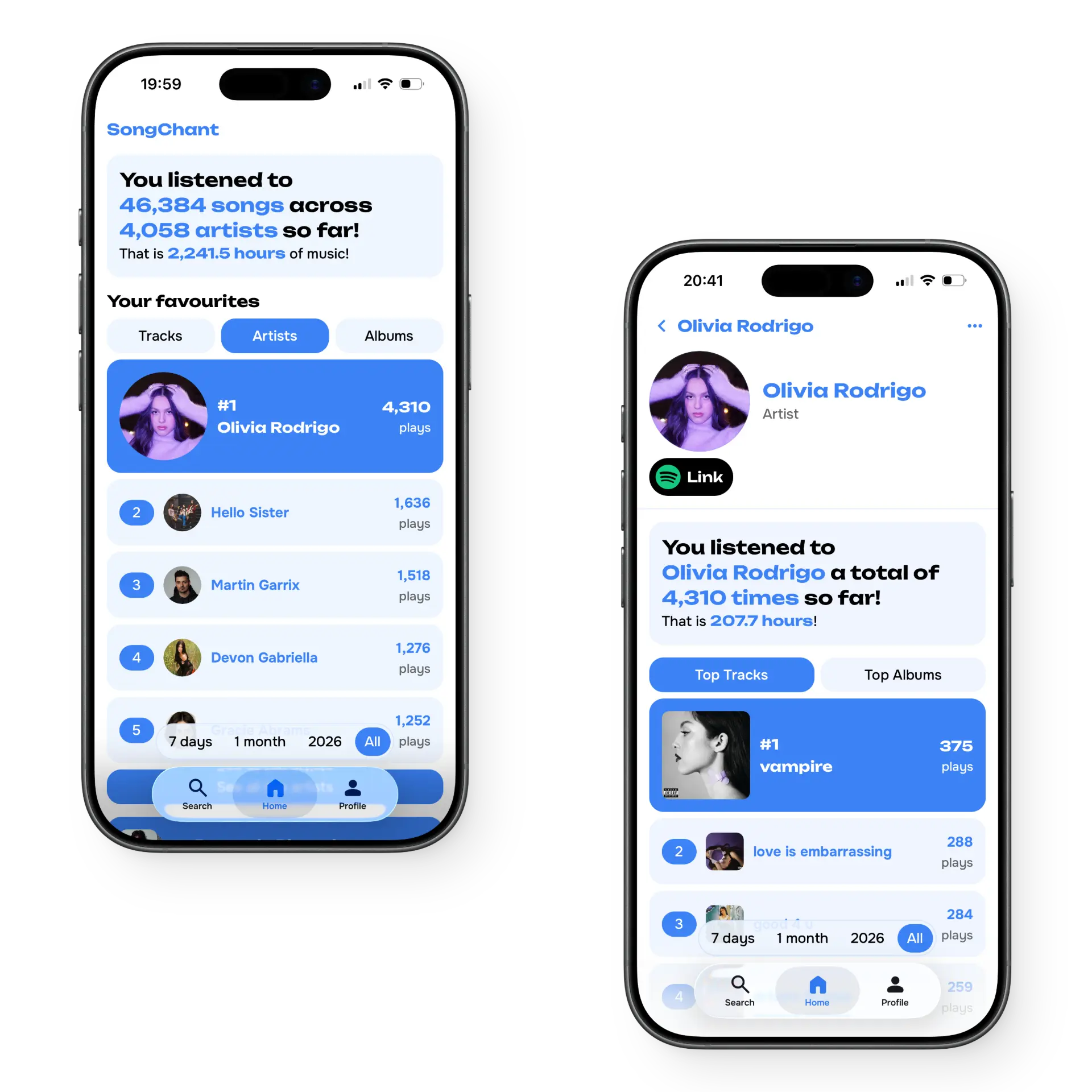 SongChant shows you your Spotify listening habits in a beautiful way. Your top tracks, artists and albums all year round, not just in December.